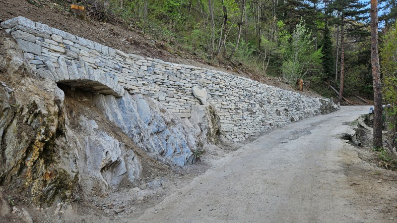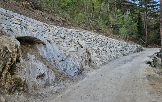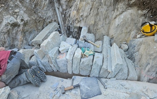 - Fachgerechte Reparatur der Stützmauer unter Wahrung der traditionellen Bauweise.
