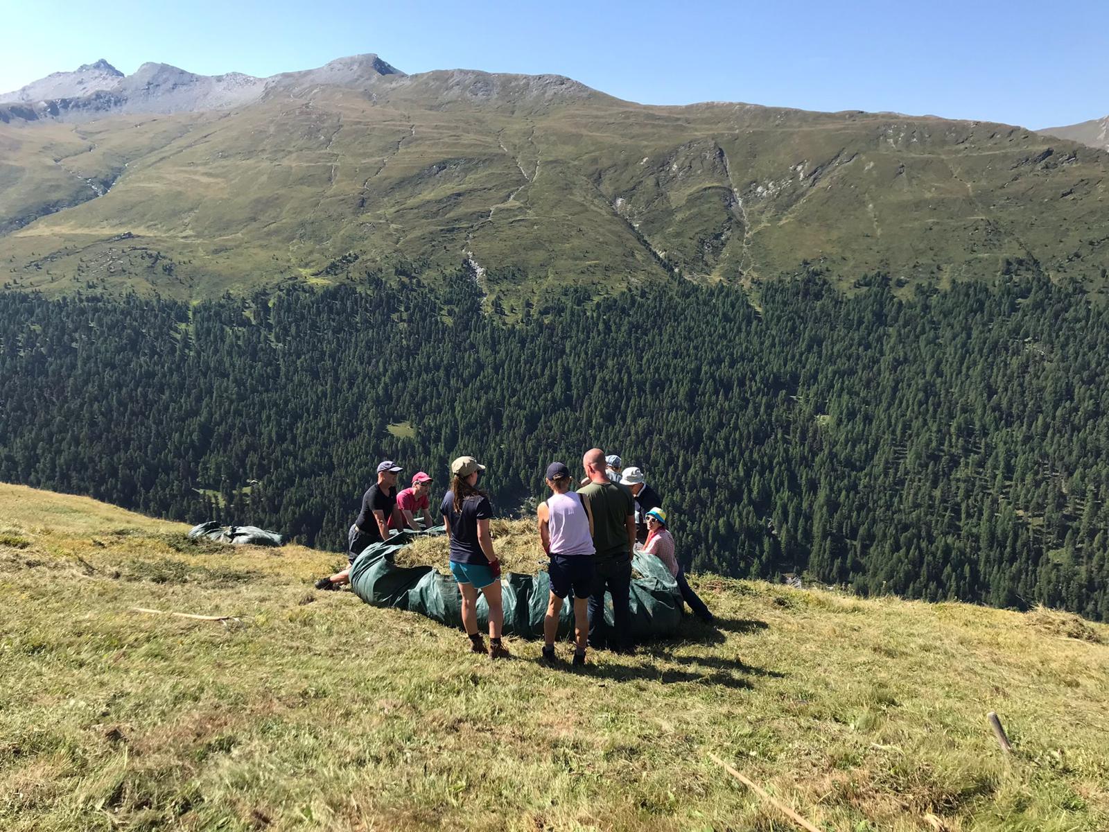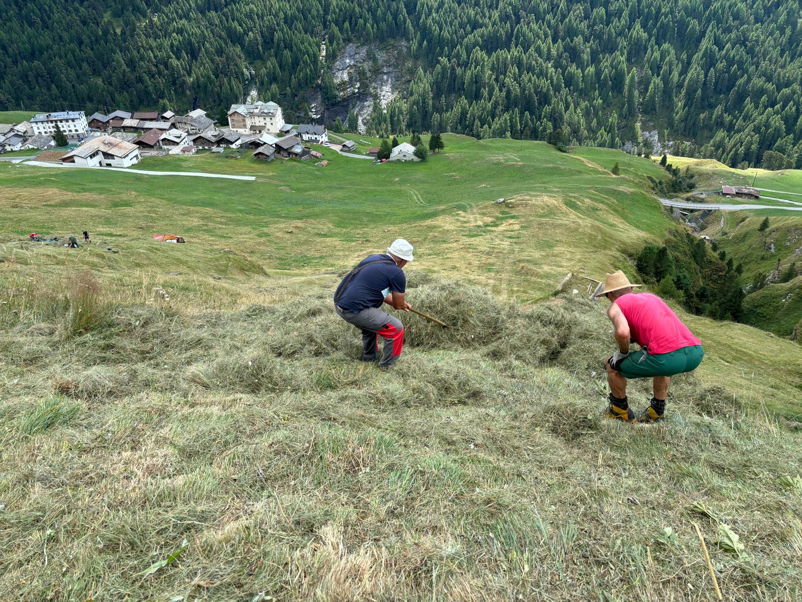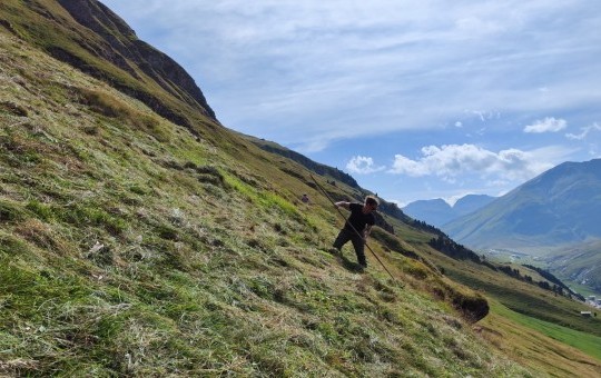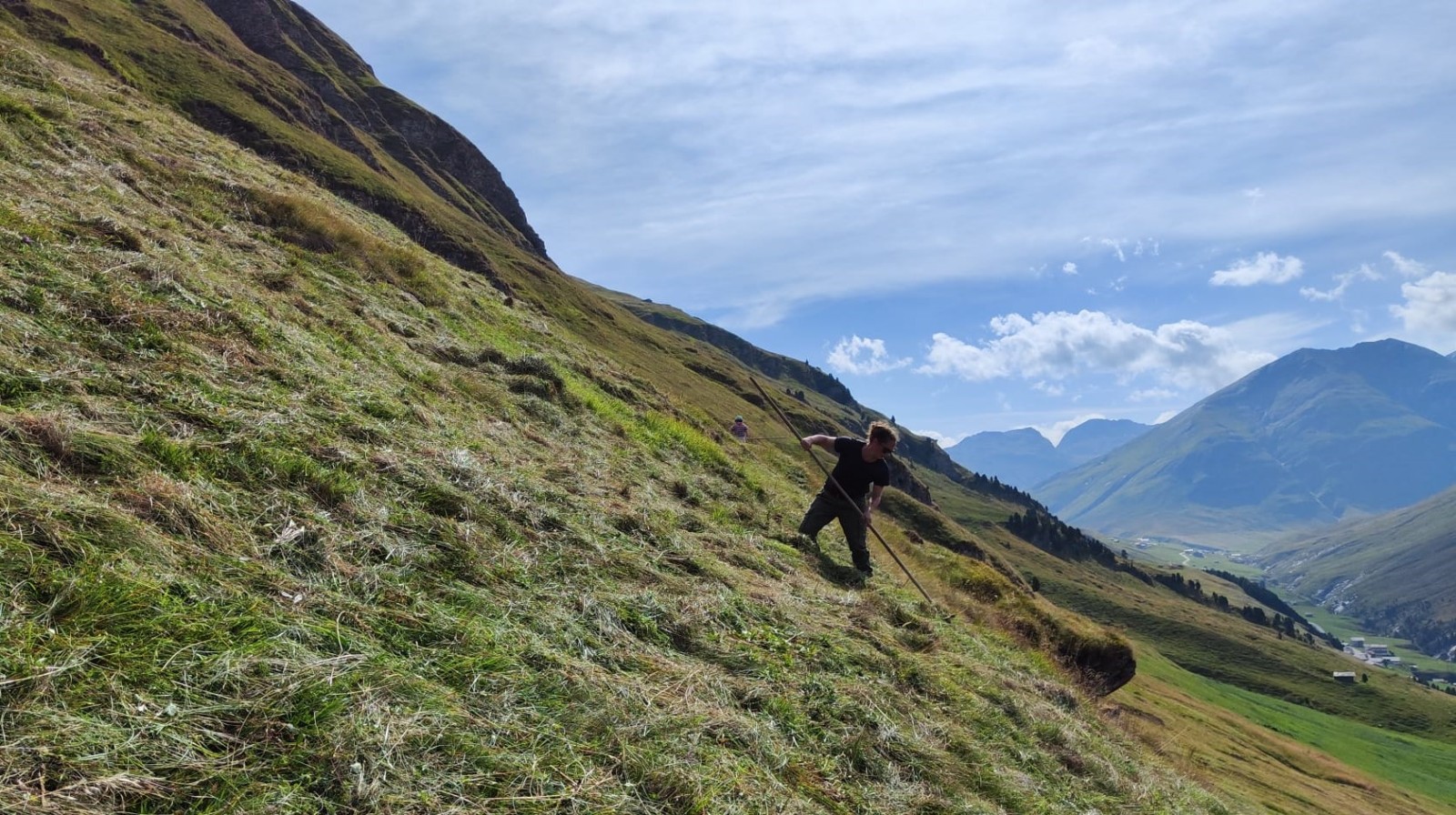 In sehr steilem Gelände Heu wenden und zusammentragen, entbuschen, Wegbauarbeiten. Es handelt sich um physisch anspruchsvolle Arbeiten.