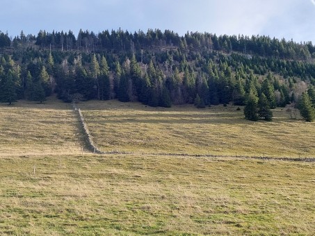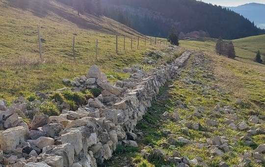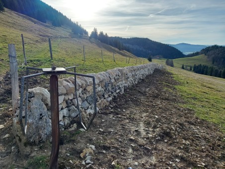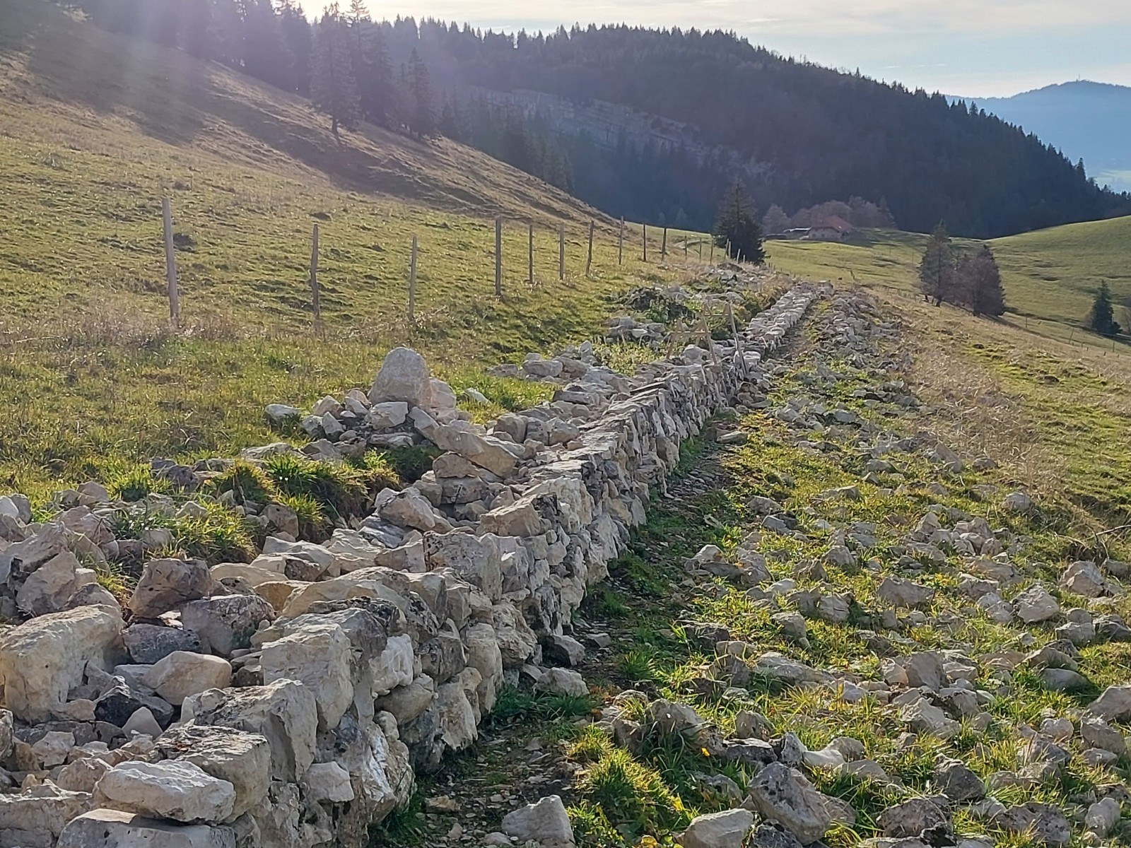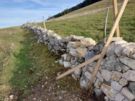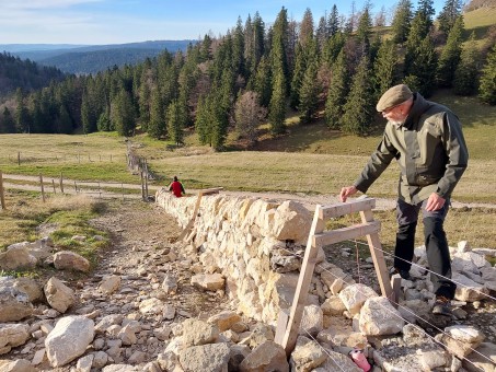 In dieser Woche wird ein weiterer Abschnitt einer der für die Region typischen Trockenmauern restauriert. Diese freistehende Mauer aus eher kleinen Steinen erstreckt sich über mehr als 800 Meter. Sie verbindet zwei Wälder, die das kleine Tal überragen und es zugleich in zwei Hälften teilen. Das Bauwerk, das bereits teilweise erneuert wurde, ist ein besonders sichtbares und landschaftsprägendes Element dieser typischen Jurakulisse.